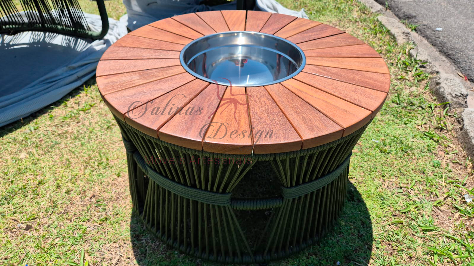 A champanheira inox em corda náutica possui estrutura confeccionada em ferro com pintura eletrostática, o que confere alta resistência contra oxidação e desgastes naturais. O tampo em madeira incorpora um visual sofisticado e acolhedor, enquanto a bandeja central em inox garante eficiência para armazenar bebidas geladas, gelo ou servir como apoio durante confraternizações.