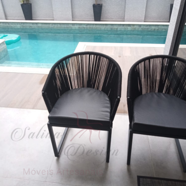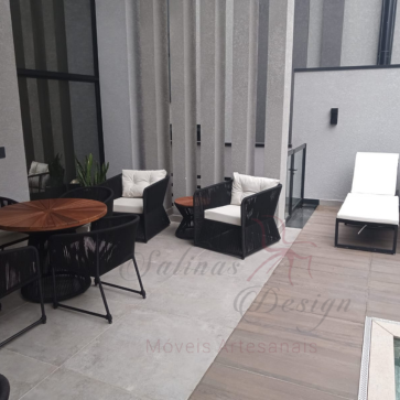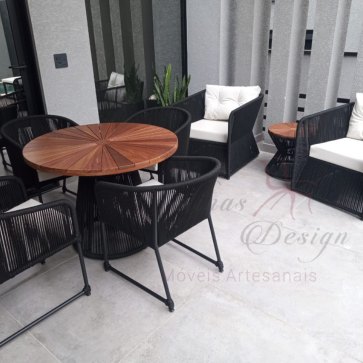 O Conjunto de Mesa Minas é produzido em corda náutica preta, um material extremamente resistente às intempéries, como sol, chuva e maresia. Isso garante excelente desempenho e preservação da estética ao longo do tempo, mesmo quando utilizado em áreas totalmente externas.